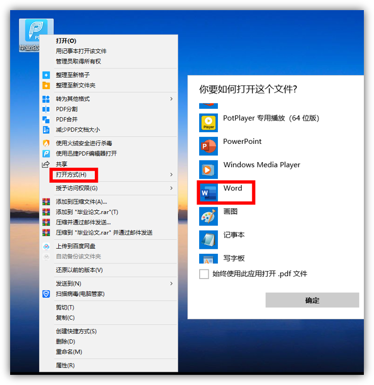 如果PDF文档里有图片和表格,那么就无法复制粘贴了。我们可以选中PDF文件,鼠标右键点击【打开方式】,选择用【Word】打开。