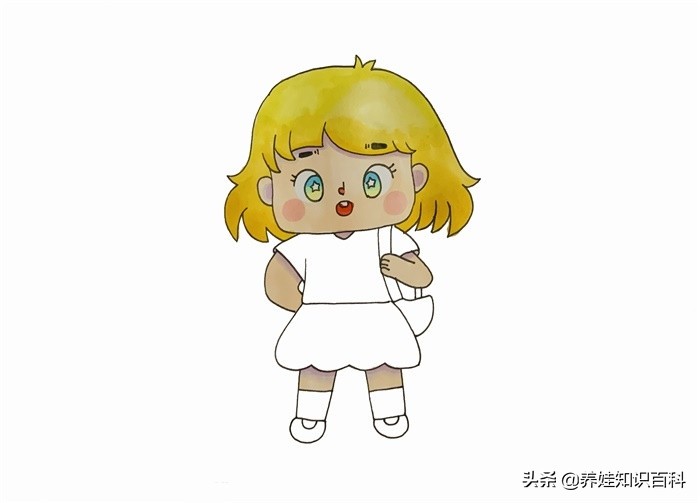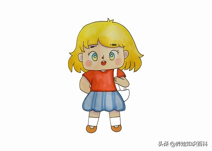 3、画完之后,就可以涂色了。用到的颜色有黄色、肤色、粉色、蓝色和红色。头发涂成黄色,皮肤和脸涂成肤色,眼睛涂成蓝色,嘴巴涂成红色,脸上再用粉色涂上腮红。