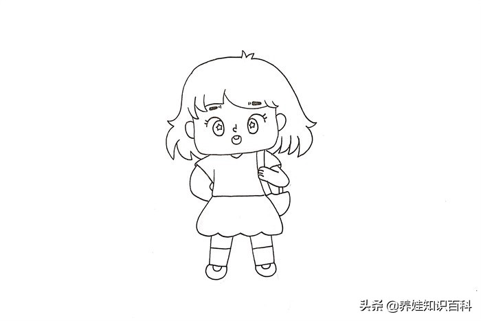 2、接着画出五官,包括眉毛、眼睛、鼻子和嘴巴。在脑袋下方,画出连衣裙代表身体。画好之后,画出胳膊和腿。在画的时候,要注意下细节。最后再画一个书包,起点缀作用。