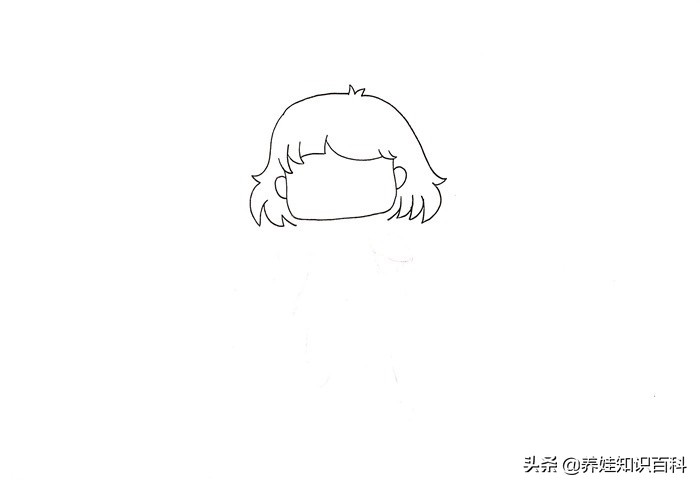 1、第一步是画出人物的头部。漫画的画法一般都会简化,用线条画出头发和脸型即可。用曲线画好头发之后,用线条画出脸型。脸型画好之后,再用对称的半圆画出耳朵。