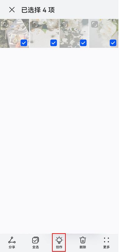 第一步:在相册勾选我们需要制作相册的图片,接着点击相册底部的【创作】–【影片】。
