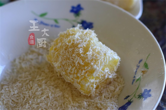 7、搅拌均匀后,将蒸好的山药放在调料里滚一滚。