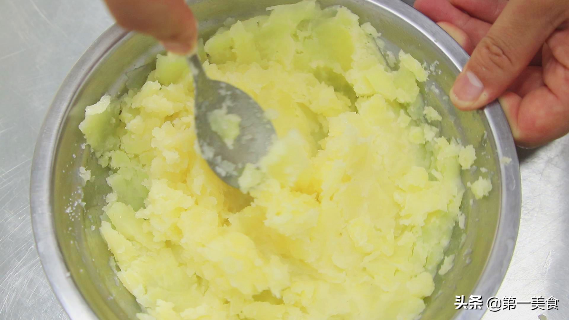 用勺子按压成土豆泥,用手摔打使土豆泥更加粘稠。
