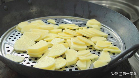 切好以后,我们把土豆片上锅蒸熟了,锅内烧水,放上蓖子,把土豆片放上蓖子上面蒸。