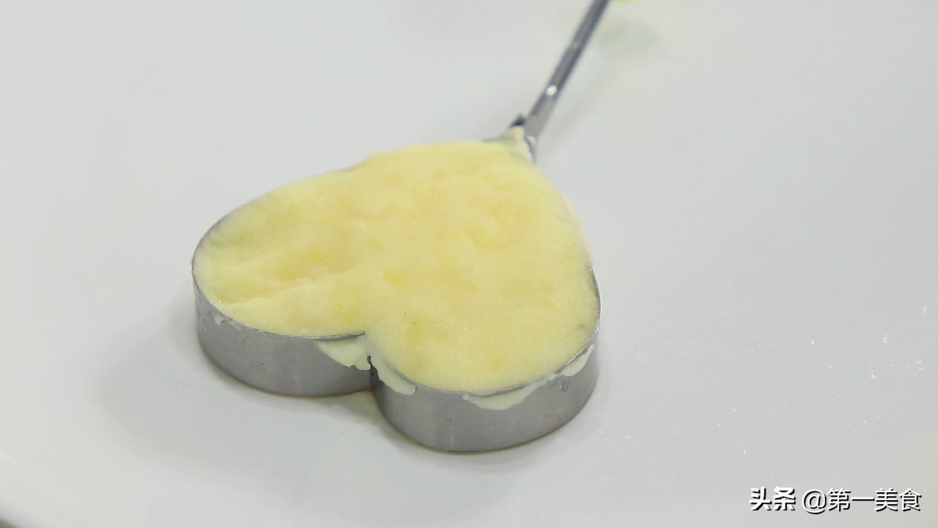 把土豆泥倒在心型模具里面,按压成一个心型,或者圆型,五角星的形状都可以。