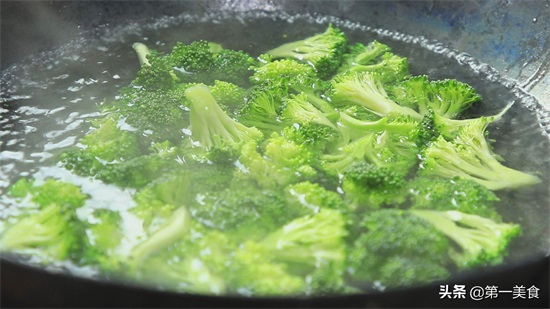 锅内再烧水,加入食盐2克,淋入一点植物油,加入食盐和植物油,焯过水的西兰花色泽更翠绿。水烧开以后,倒入西兰花焯水至西兰花断生。