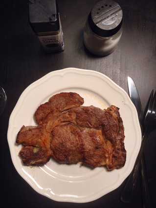 6. 出锅后,在盘子上静置5分钟(很重要),最后才撒上黑胡椒和粗海盐(没有的话就用普通的食盐)。对牛排来说,最后洒粗盐的口感也比腌渍入味的要精彩。