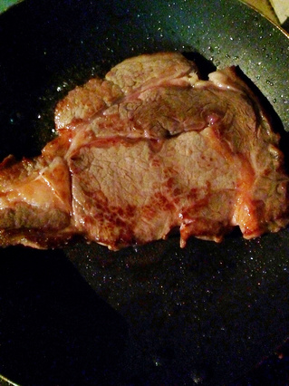 3. 火稍大些,油热气后放入牛排。牛肉刚下锅温度一定要够热,这时牛肉表面一层肉脱水变硬,牛肉的汁水才不会外泄,也就是锁汁。颜色变为深褐色,并且散发出煎炸的香味,如果平底锅够厚会有助于保温。