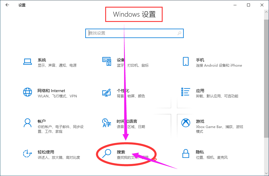 进入“Windows 设置”窗口以后,单击下面【搜索】选项打开;
