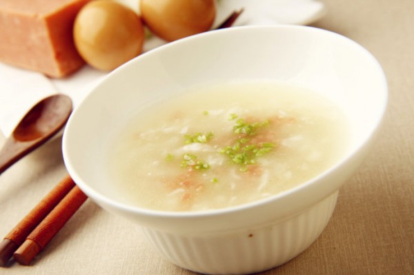 2、锅内倒入高汤,冬瓜茸加入熟鸡油、盐、糖,调匀煮沸,鸡蛋白打散,徐徐淋入锅中。
