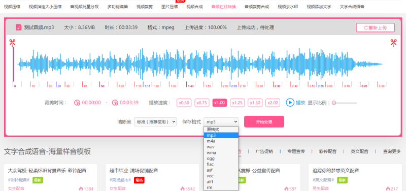点击选择视频上传,选择转换音频格式,点击开始处理。