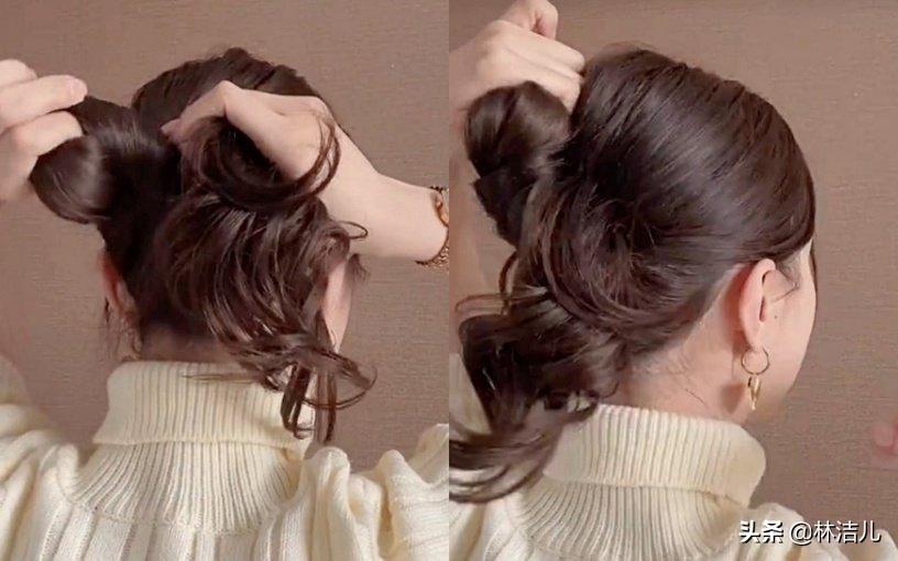 留出来的发尾可以用梳子稍微刮松,这款盘发比较有女人味,而且是像小马尾一样,中短发也很推荐。