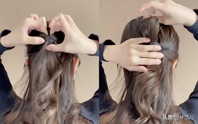 跟刚刚那款有点像,但是这款半扎发分出的区域会更多,可以分出三分之二的头发之后,用食指扭转马尾,接着往上推成一个发髻,再用鲨鱼夹夹起固定。