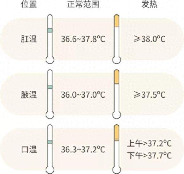 在相同环境条件下,不同种类的体温计在同一部位的测量结果可能不同,同一种体温计在同一个体不同部位的测量结果也可能不同。通常定义的正常体温范围在36~37℃左右。根据《诊断学》 及 UTD 参考文献,我们整理了一份相对全面的“人体温度表”: