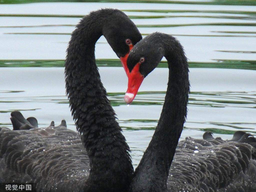 A pair of black swans shaped like a heart as they move closer to each other in a lotus pool in Beijings Old Summer Palace on Aug 3, 2019. [Photo/VCG]