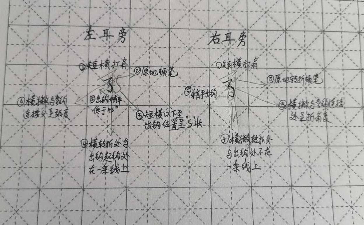 下来主要讲一下横撇弯钩这个笔画,为什么很多人都写不好?包括我本人在内,主要还是因为这个笔画它的连续变化和复杂性,它复杂在什么地方呢?一个是笔画多,里面有短横、小撇、弯钩这几个笔画都包含在里面,另一个是连续转折与衔接,还要带弧度和出钩,特别是弯钩还有一定的倾斜度,并且这个笔画还不能写大。所以说要在这个小小的这个空间里面把笔画的连续转折、衔接、出钩等,把这些技法全部在这小小的范围内用笔法施展表现出来,这才是最难的。横撇弯钩,几乎涵盖了一部分笔画的书写技法,这个笔画相当考验一个人的运笔能力。所以有的家长如果想考验一位书法老师的书写水平,就可以拿这个横撇弯钩,让她写几个字就能看出看出她的功底了。