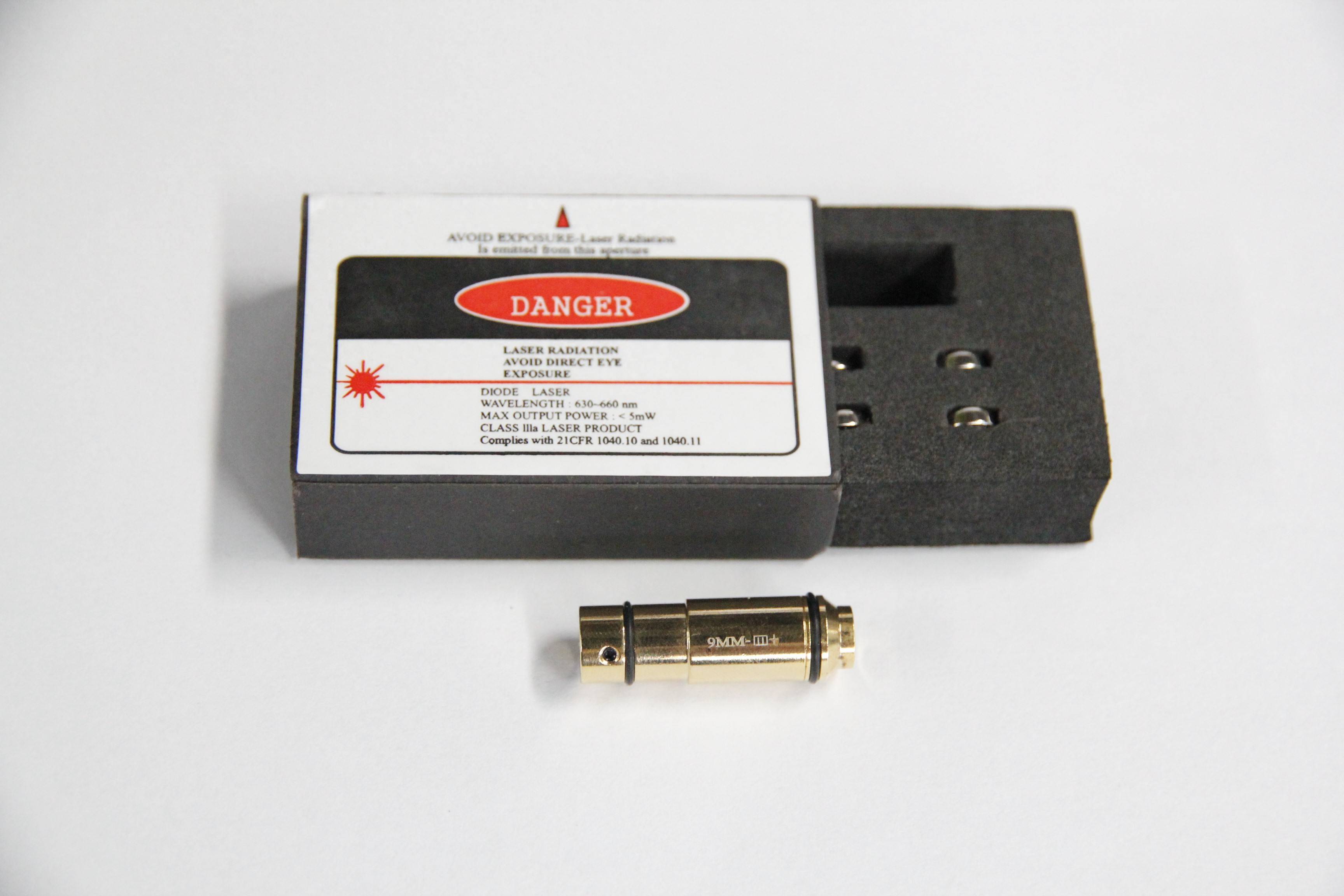 东莞市蓝宇激光有限公司生产、销售的激光训练弹有9mm平头(JAP6505-118)和9mm锥头(JAP6505-116)以及45ACP(JAP6505-117)激光训练弹这三种,也可以支持定制其他类型的激光练习弹。采用的650nm红光激光光源,其他的波长也支持定制,同心度直径小于0.5°,光点大小在10米处光斑小于15mm,LR626纽扣电池供电,配包装盒。