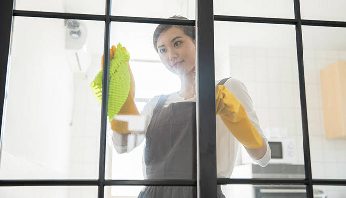 针对有油污的淋浴房玻璃,用保鲜膜和含有洗涤剂的湿布擦拭最好,具体操作方法是先用洗涤剂全面喷洒在玻璃上,然后用保鲜膜贴上玻璃,等个10分钟,玻璃上的油渍就会软化脱落,这时我们只要把保鲜膜撤掉,再用湿布擦拭干净即可。对于一些油迹,可以直接用棉花蘸醋擦掉即可。