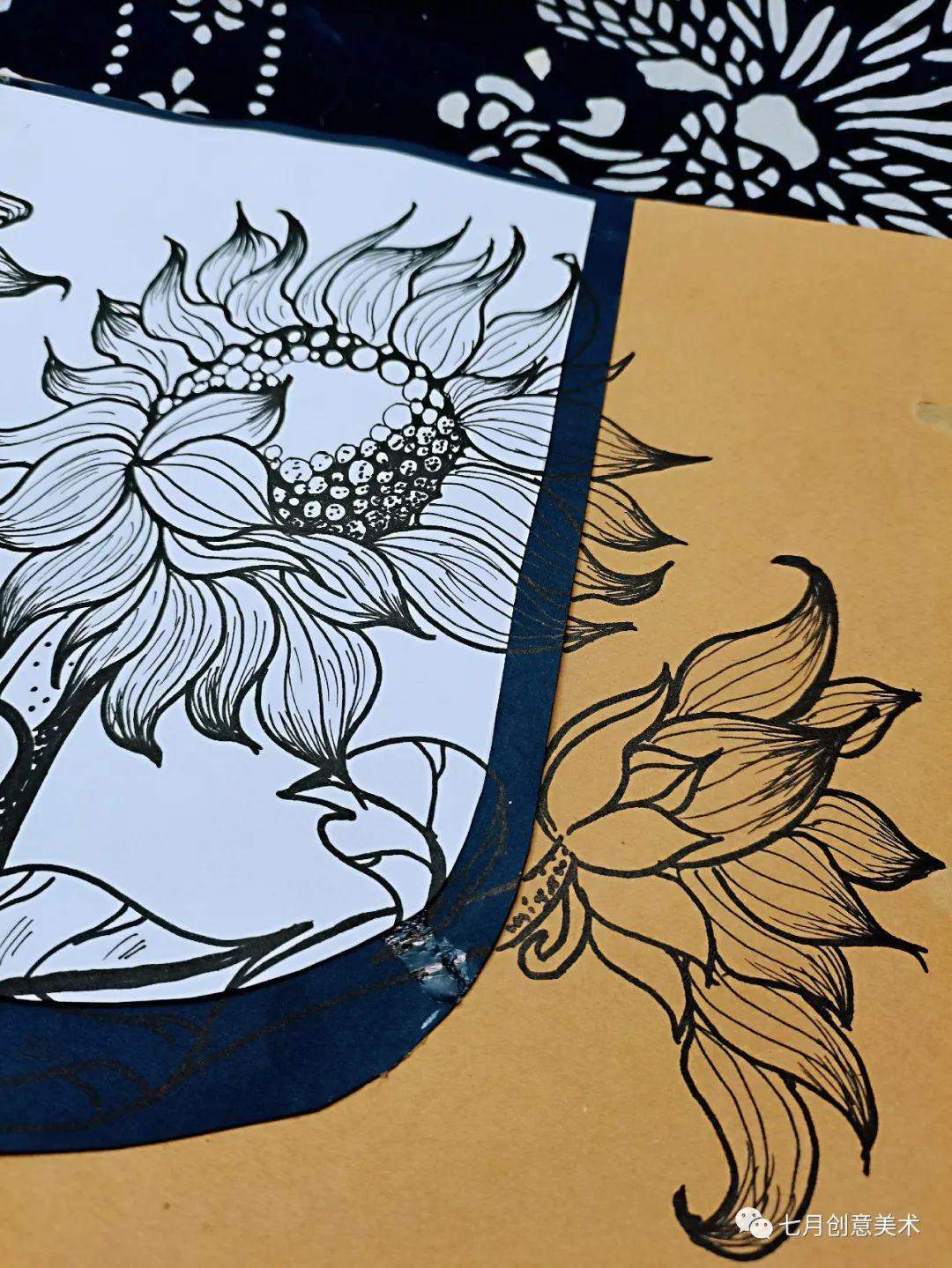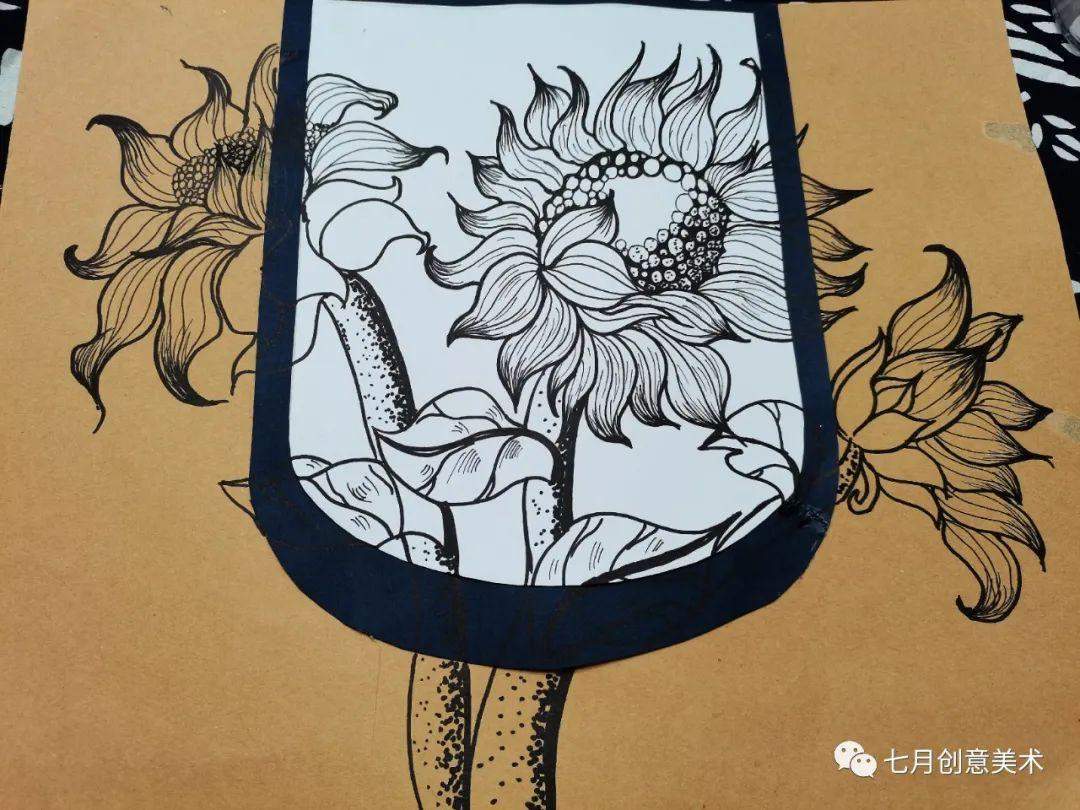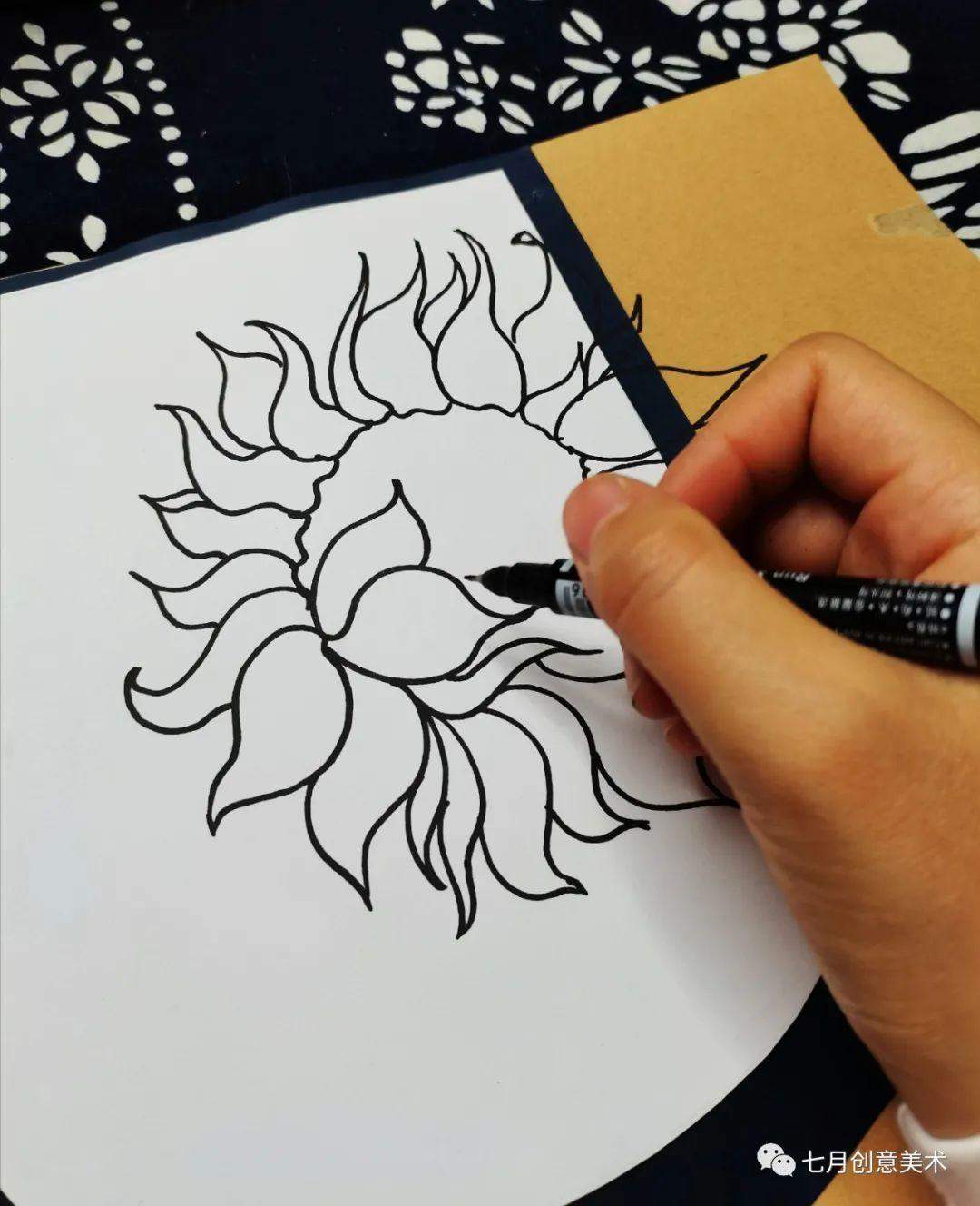 ② 在贴好的纸张上面用勾线笔画出向日葵的轮廓