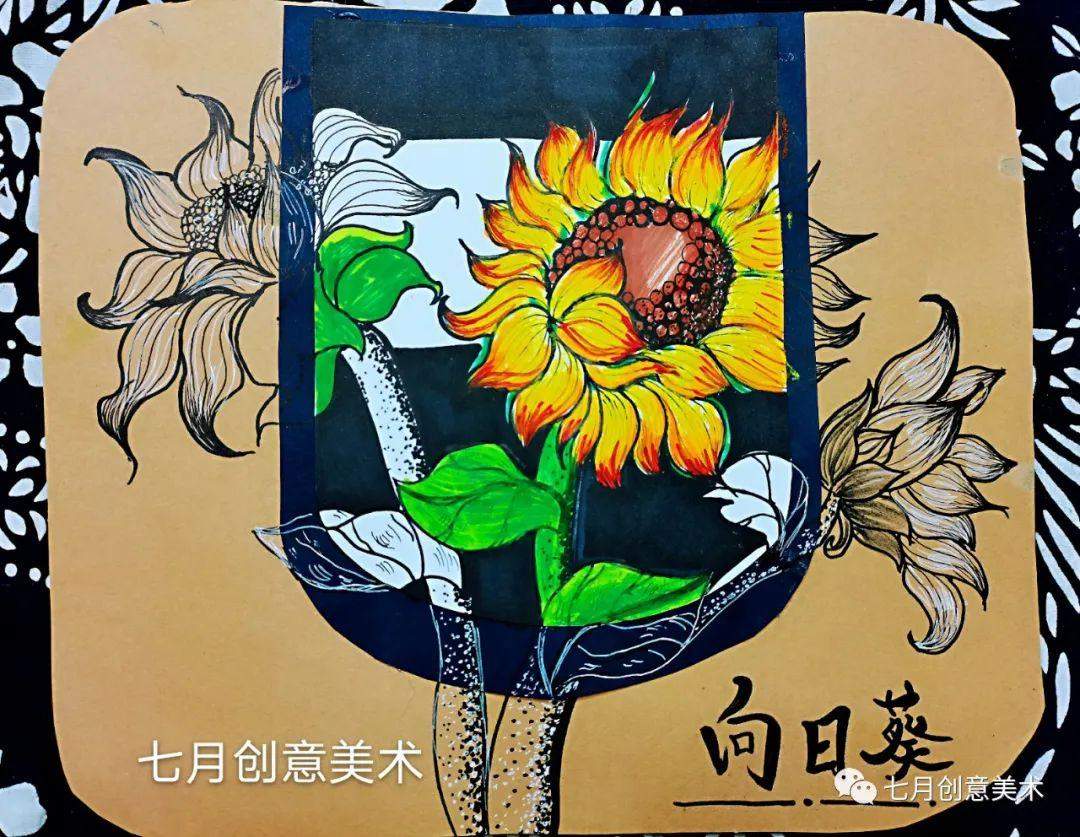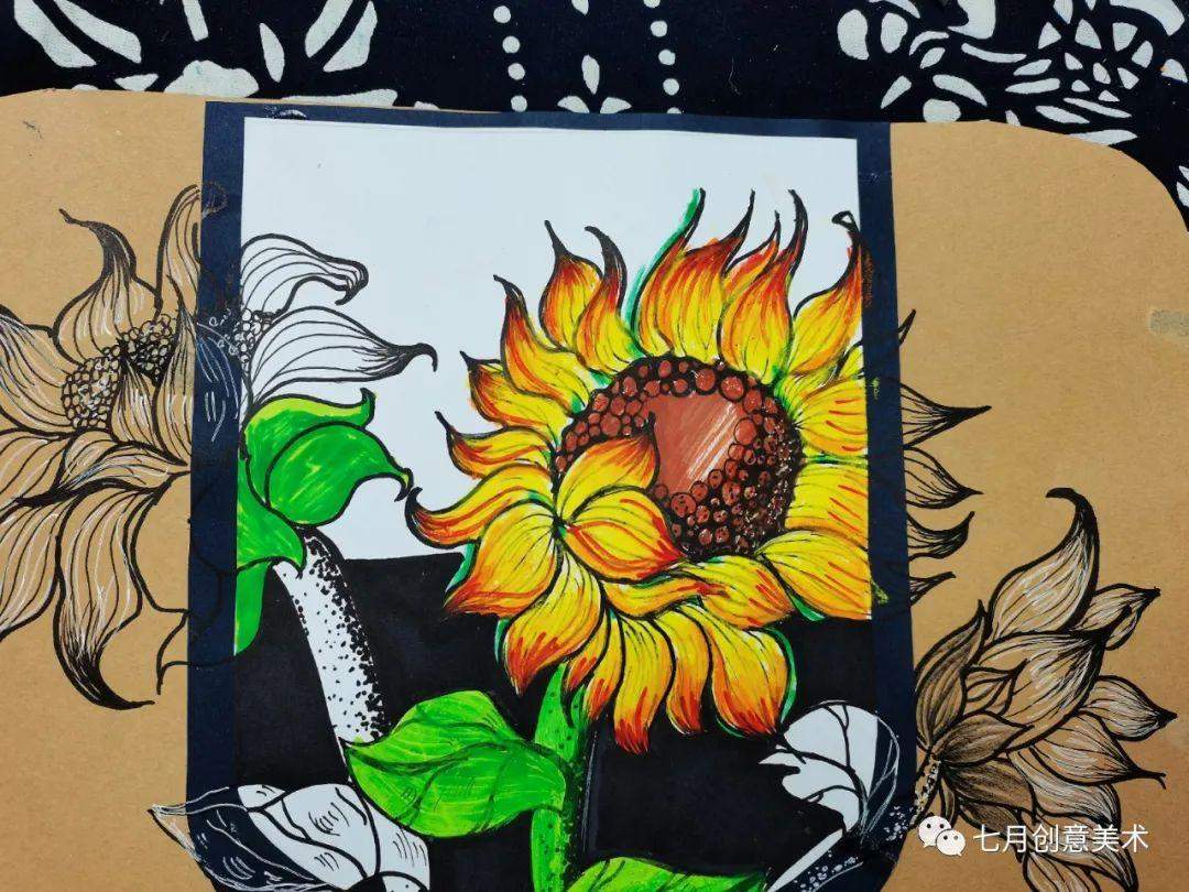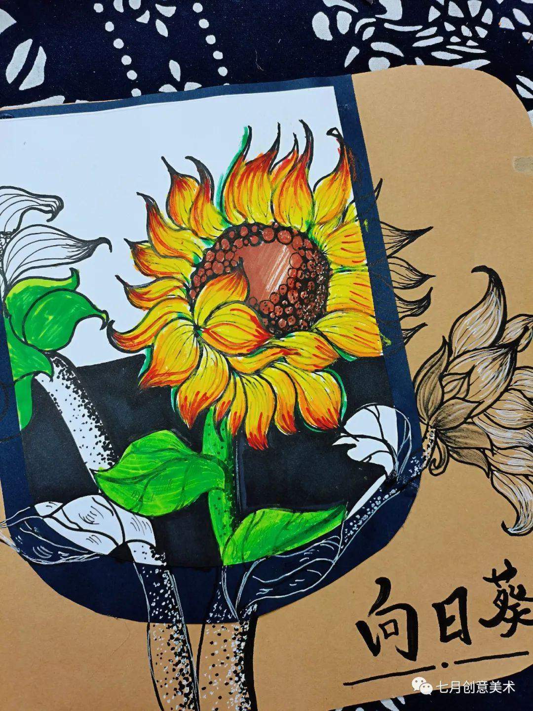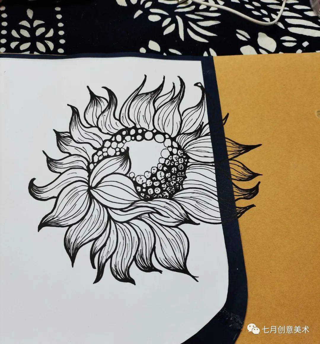 ② 在贴好的纸张上面用勾线笔画出向日葵的轮廓
