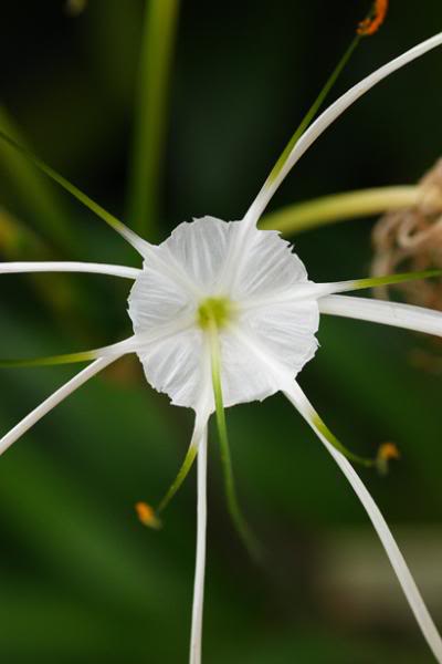 它的特别之处在于全身上下都是白色,上面垂下来的就是它的花,花心是黄色的。
