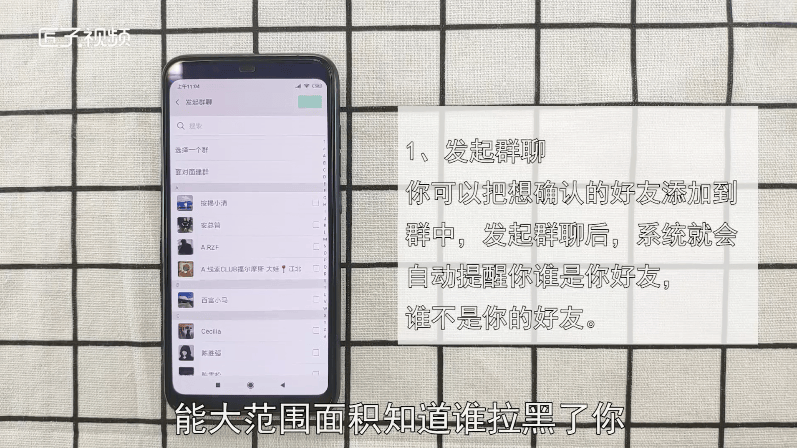 这种方式不动声色也很有效果,能大范围面积知道谁拉黑了你。你可以把想确认的好友添加到群中,一次最多添加到39个,发起群聊后,系统就会自动提醒你谁是你好友,谁不是你的好友。