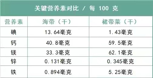 下图是裙带菜和海带在关键营养素上的含量对比: