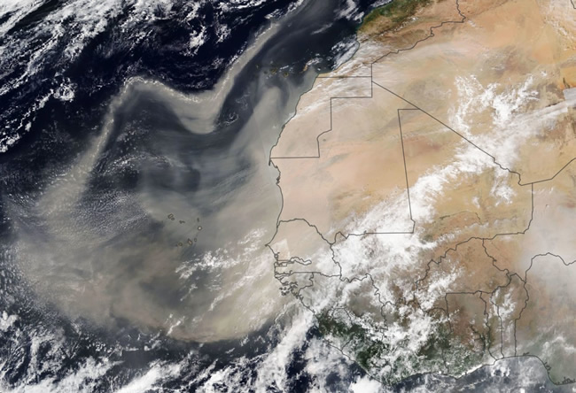 沙尘自东向西移动,经过非洲西海岸,进入到大西洋海域,随着风力的减弱,很多的沙尘都会降落到大西洋海面。