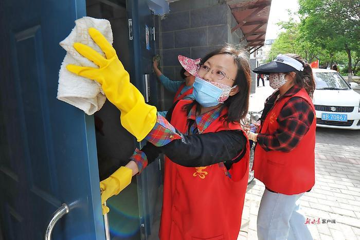 党员志愿者清洗居民楼单元门。(资料图)