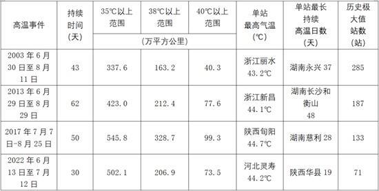 进入21世纪以来,我国大范围持续高温事件典型年份有2003年、2013年、2017年等。总体看来,今年的高温事件开始时间早于上述3年,持续时间和历史极值站数目前还不及这3年,影响范围和单站最高气温虽也不及2017年,但已超过了2003年和2013年。