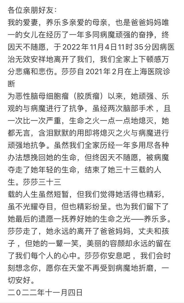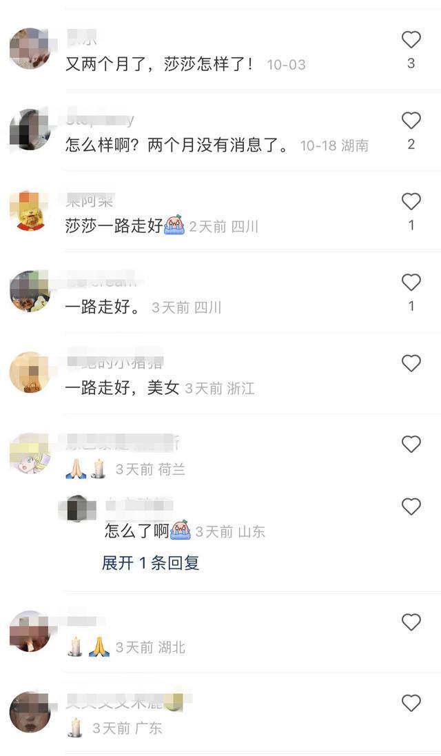 当时,网友纷纷询问莎莎的最新情况,但账号已经没人回复,两个月都没有更新,直到11月4日,杨韬发布妻子的死讯。