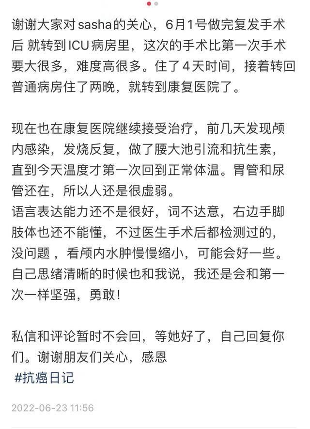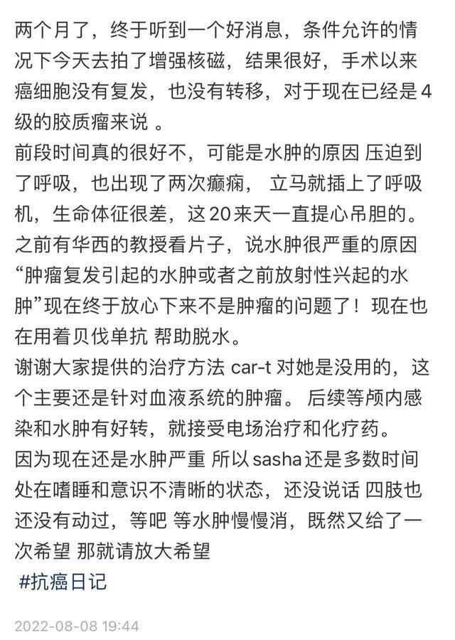 6月,做完手术的莎莎已经没有力气更新社交网,所有的内容都交给丈夫发布。