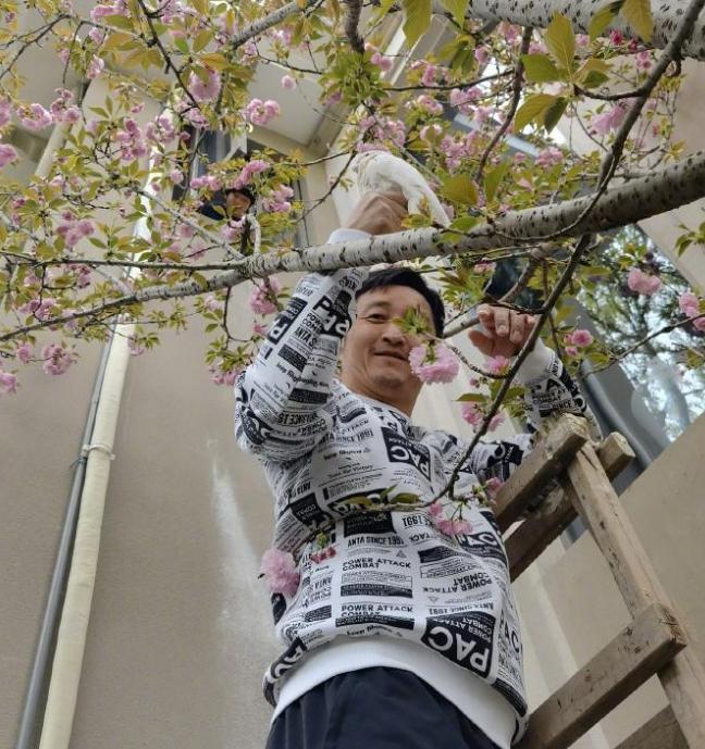 邹市明和家人相伴的时候,也会一起修剪花草,爬上高高的支架,为开花中的大树修剪枝叶……”
