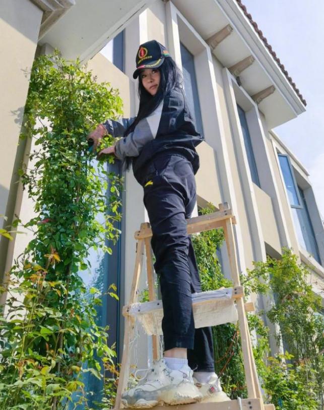 “冉莹颖亲自爬上三脚架上,修剪爬到高墙上的花草枝叶;
