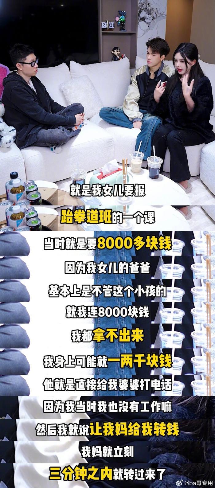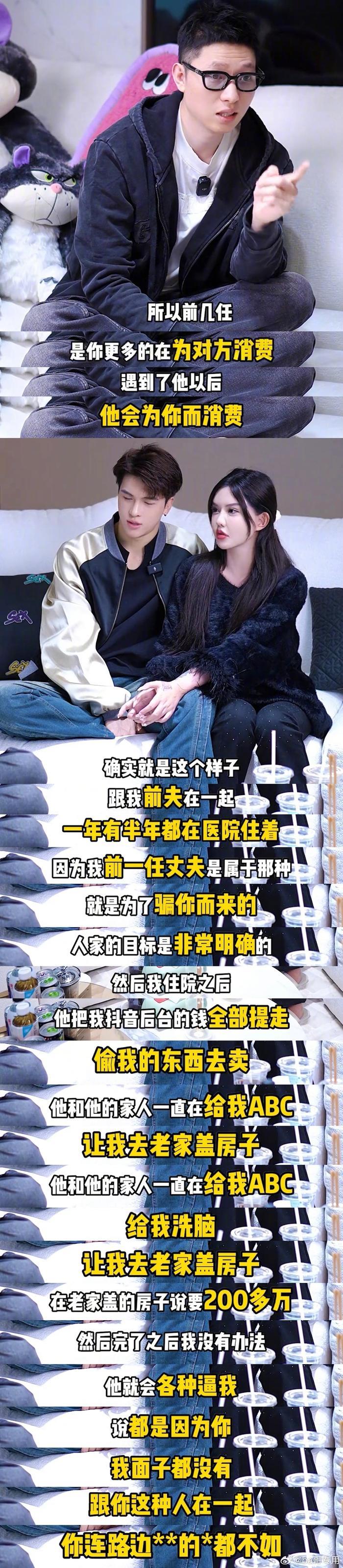 首先,韩安冉带着宋浩然做节目,哭诉说当初第一次结婚后,小猪先生对她不好,pua她,也不关心他们的女儿。她作为一个大网红,身上连一两千块钱都没有,钱被男方管死死的。(图一,图二)