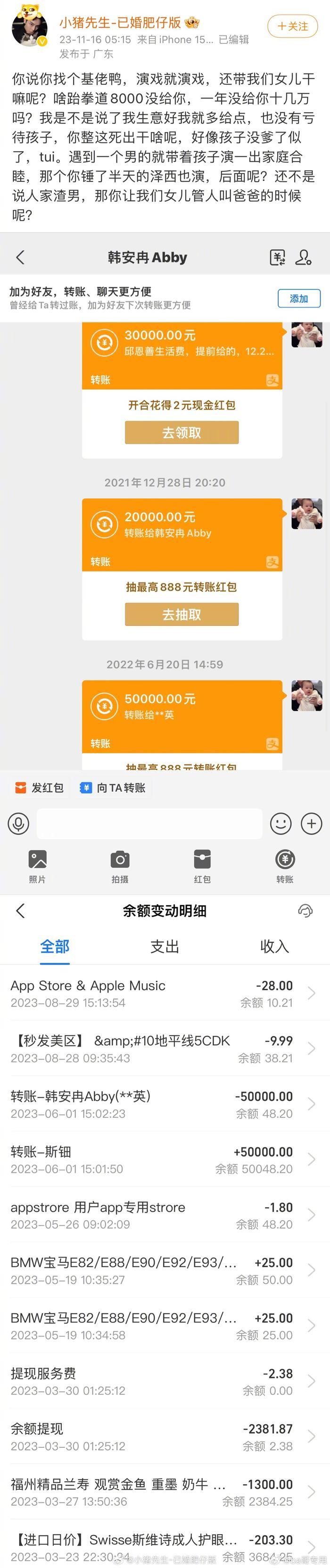 小猪先生看到采访勃然大怒,说韩安冉撒谎,说那一年他给韩安冉十几万,并晒出转账记录。(图三)