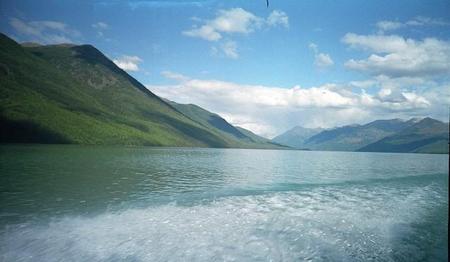 快艇行驶在湖中间,窗外泛着洁白的浪花,两边青山如黛,远处的雪山在阳光的照射下宛如圣山,说实话,景色确实比在岸边观看美的多。负责开快艇的师傅也很有意思,他特意把船开到人们曾经发现水怪的区域停下,然后指着水面绘声绘色地介绍了一遍发现水怪的过程,引得大家啧啧称叹,不停地拍照,同时又只恨自己运气不好,不能跟水怪近距离接触,最后只能带着遗憾回到了码头。