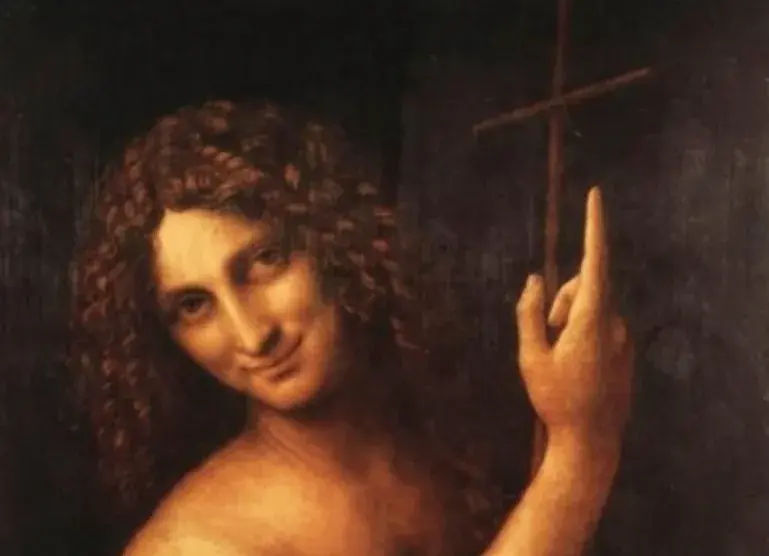 如果说《蒙娜丽莎》里的外星人是巧合。那么达芬奇的这幅作品中也同样出现了外星人,这又作何解释呢?除了蒙娜丽莎,达芬奇还有一幅画作《施洗者圣约翰》也同样出现了外星人。据说这幅画,达芬奇到了晚年的时候,都随身携带。画中的施洗者圣约翰是一个英俊的年轻人,同样面带微笑。但更加诡异的是,圣约翰的左手拿着一个十字架,右手指向黑沉沉的天空。脸上的笑容看上去既神秘又阴沉,似乎在提醒大家看向他手指的方向。
