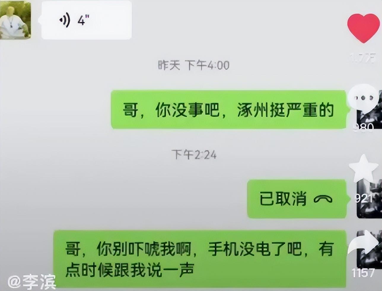 曾经在《魔幻手机》里饰演“陆小千”一角的李滨,和谢宁也是多年好友,对于涿州灾情一直都在关注,当得知大雨已经成灾,李滨也第一时间想和谢宁联系,想得到他是否安全的消息。