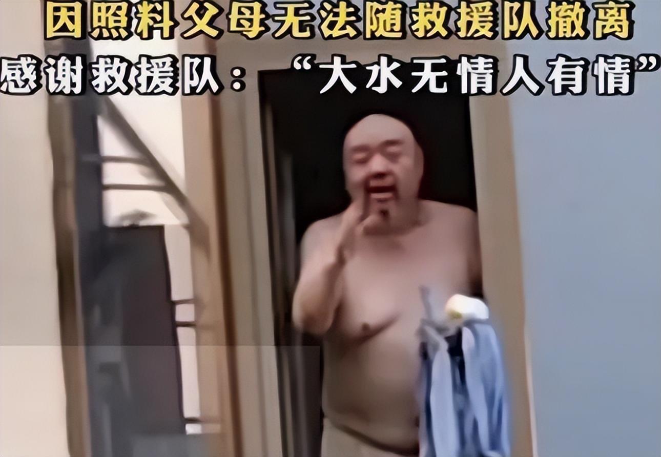 救援队官方在解救谢宁一家的视频中可以看到,谢宁的家已经被洪水淹没了两层,发现谢宁的时候,他光着膀子站在房屋第三层窗口向搜救人员打招呼。