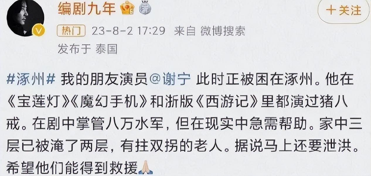 这位叫作“编剧九年”的网友在发文中称,谢宁是他多年好友,此时涿州灾情使得家中房屋都已经被淹,并且老人也行动不便,据说还要泄洪,希望对谢宁一家做出紧急救援行动。