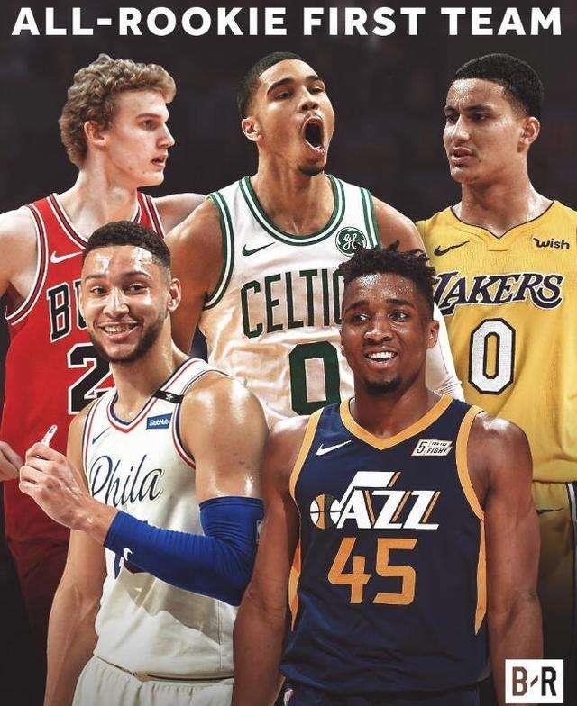 最佳新秀一阵:西蒙斯(76人)、米切尔(爵士)、塔图姆(凯尔特人人)、库兹马(湖人)、马尔-卡宁(公牛)。