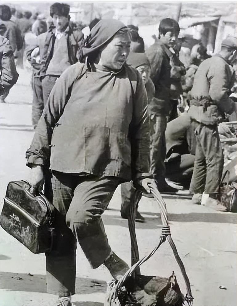 1988年,山东临沂,一手拎皮包,一手提鸡篮上集市的农妇。