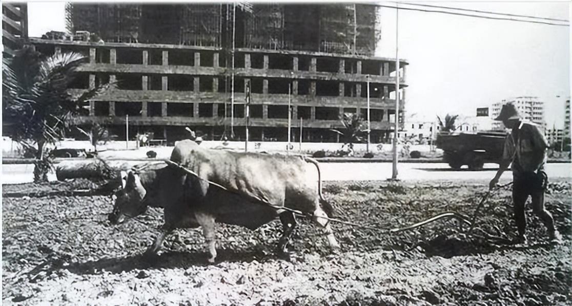1989年,海南海口,城市急剧膨胀,高楼、耕地、汽车和牛挤在了一起。
