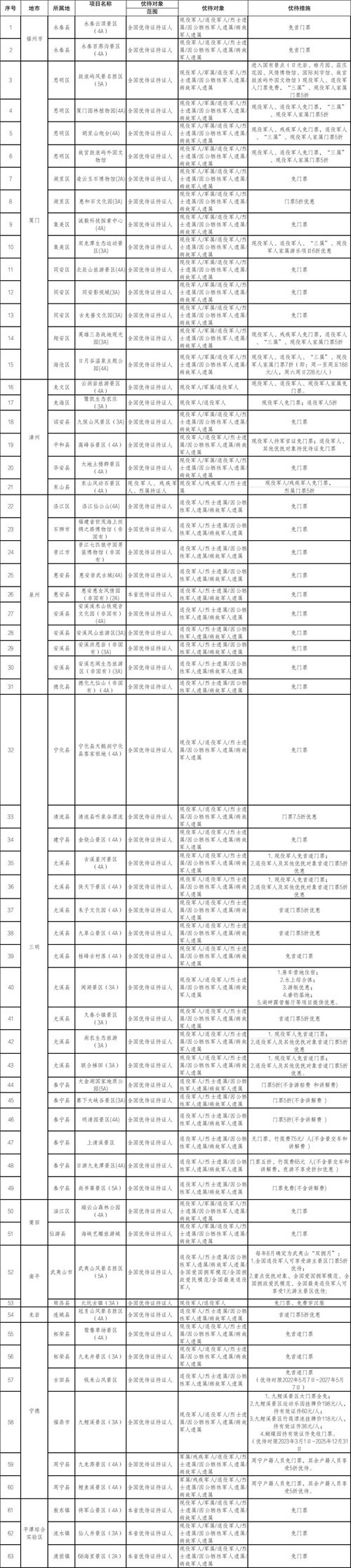 福建宣布63个A级景区