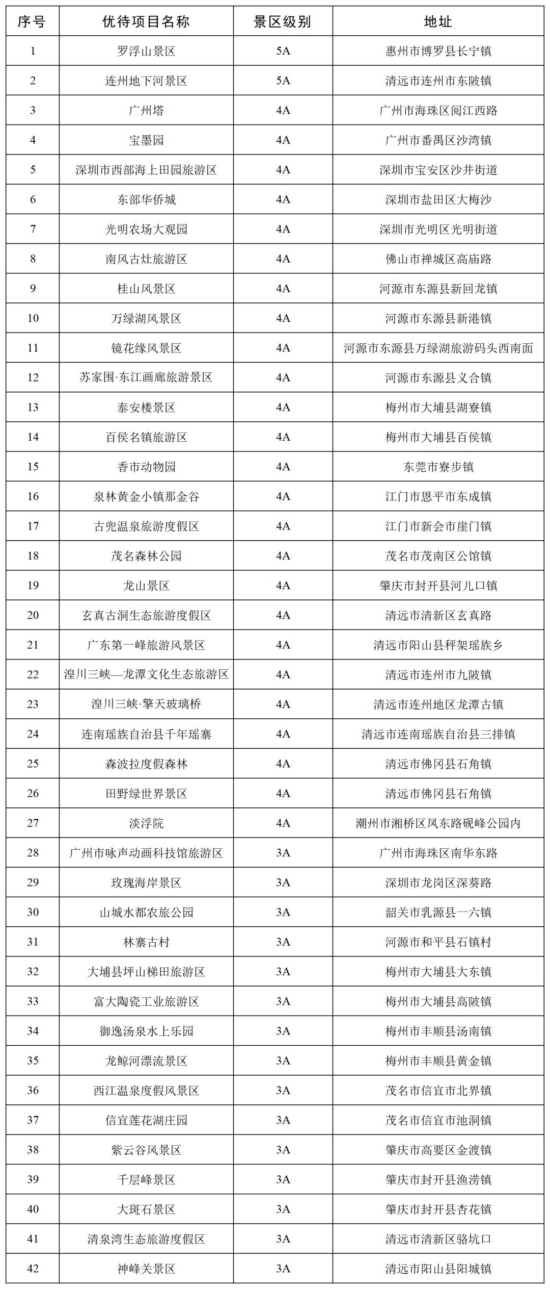 广东省42家3A级以上景区