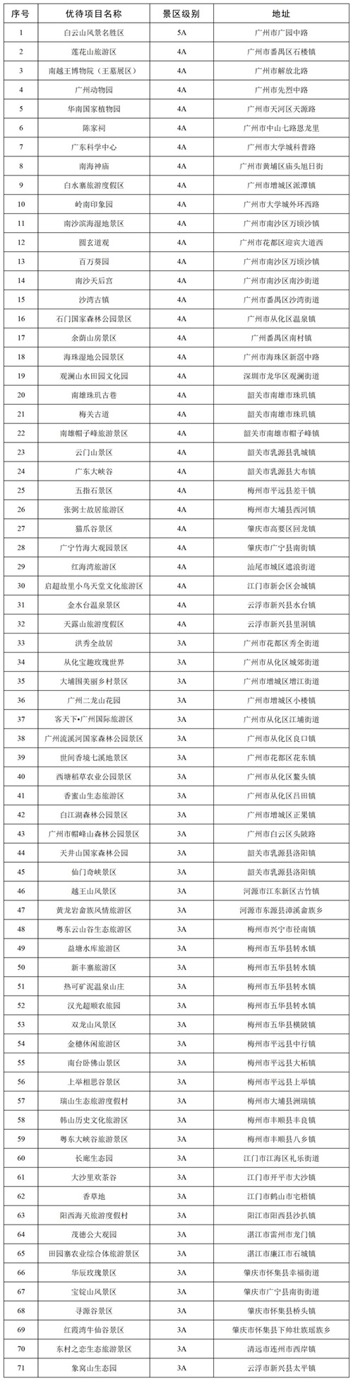 广东省71家3A级以上景区