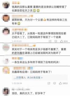 判决结果公布后,网友纷纷留言道:“这么多年终于等来了一个结果”、“有这样的母亲真的三生有幸”……