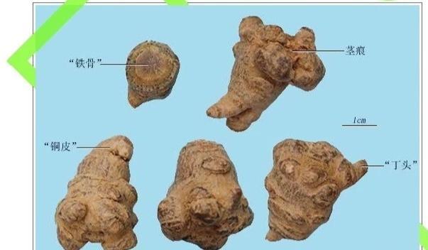 顶端有茎痕,周围有瘤状突起。体重,质坚实,断面灰绿色、黄绿色或灰白色,木部微呈放射状排列。