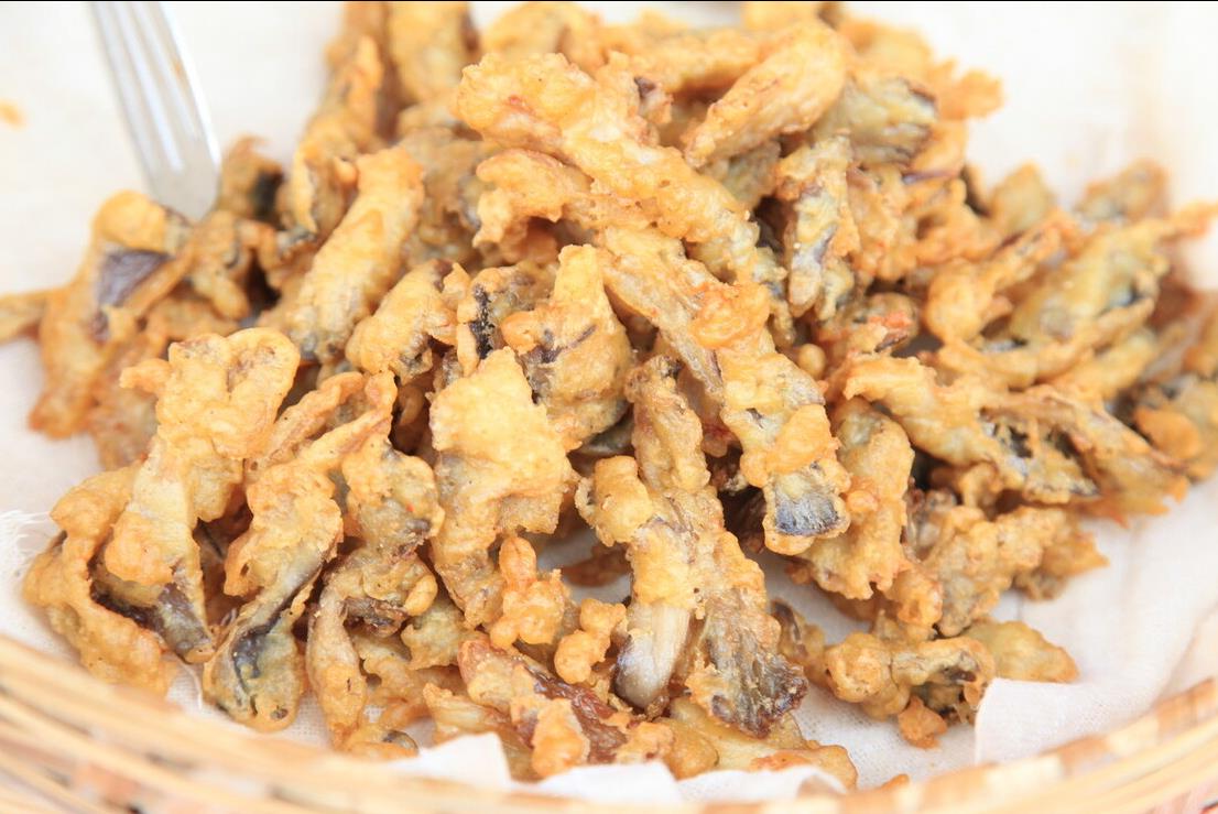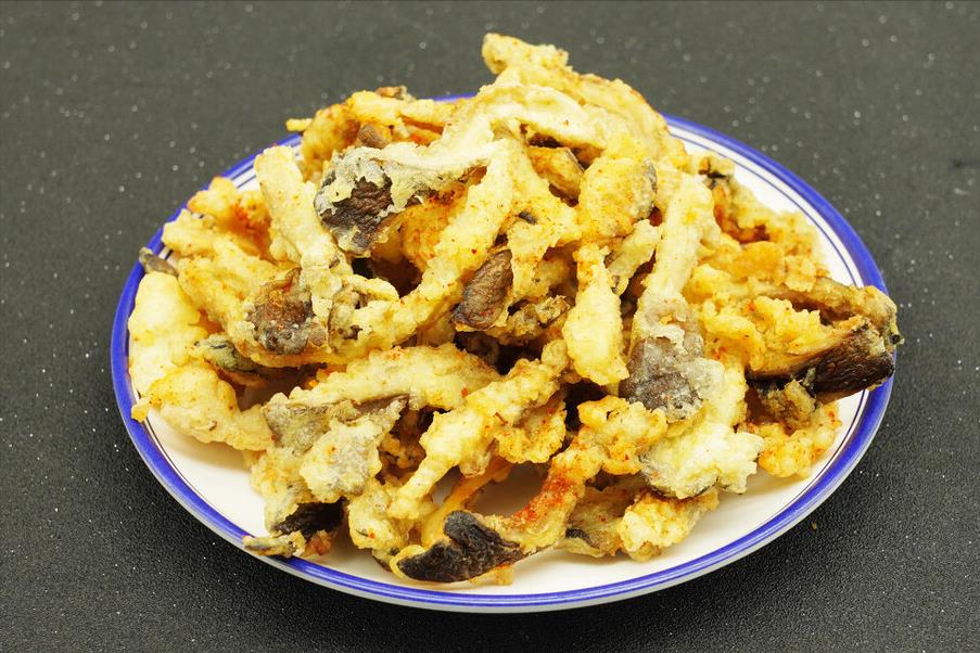 4、把蘑菇放到面糊里,用筷子搅拌好,锅内倒油,烧热到筷子周围冒小泡时,就可以把蘑菇一根一根地放进去了,炸到变硬、变黄之后,把它们捞出来。紧接着把油温升高至8成热,再把蘑菇放进去,复炸15秒,紧接着就可以控油捞出,开吃了。